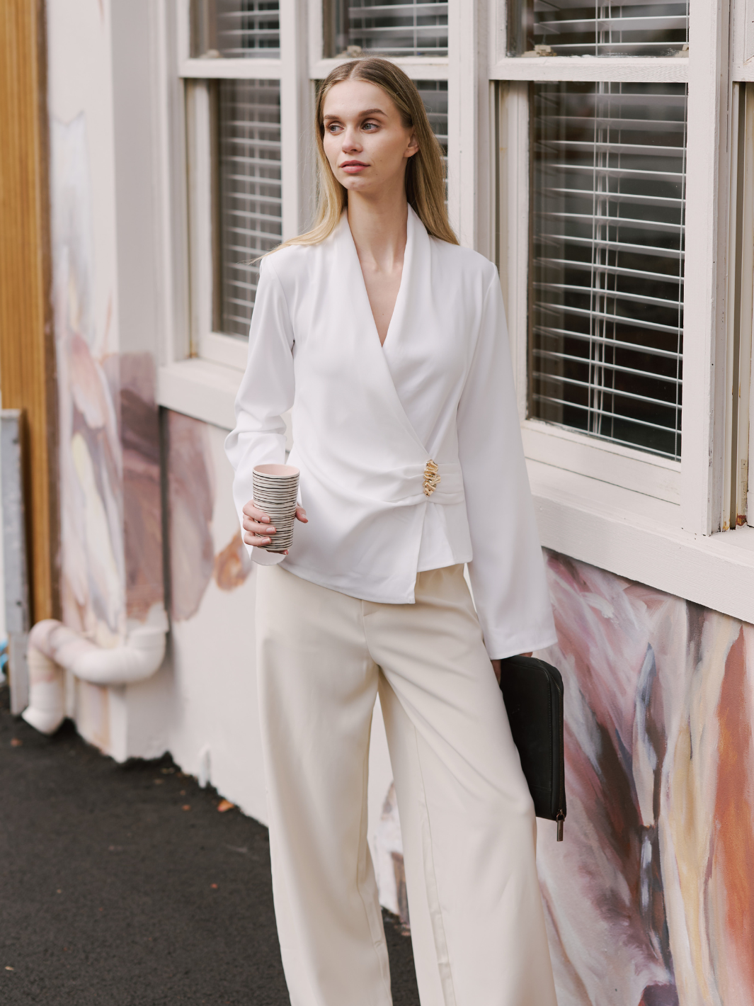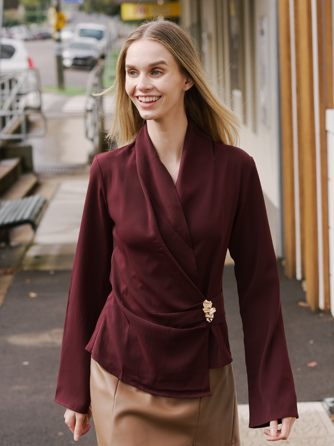 • Long sleeve, relaxed crossover top
