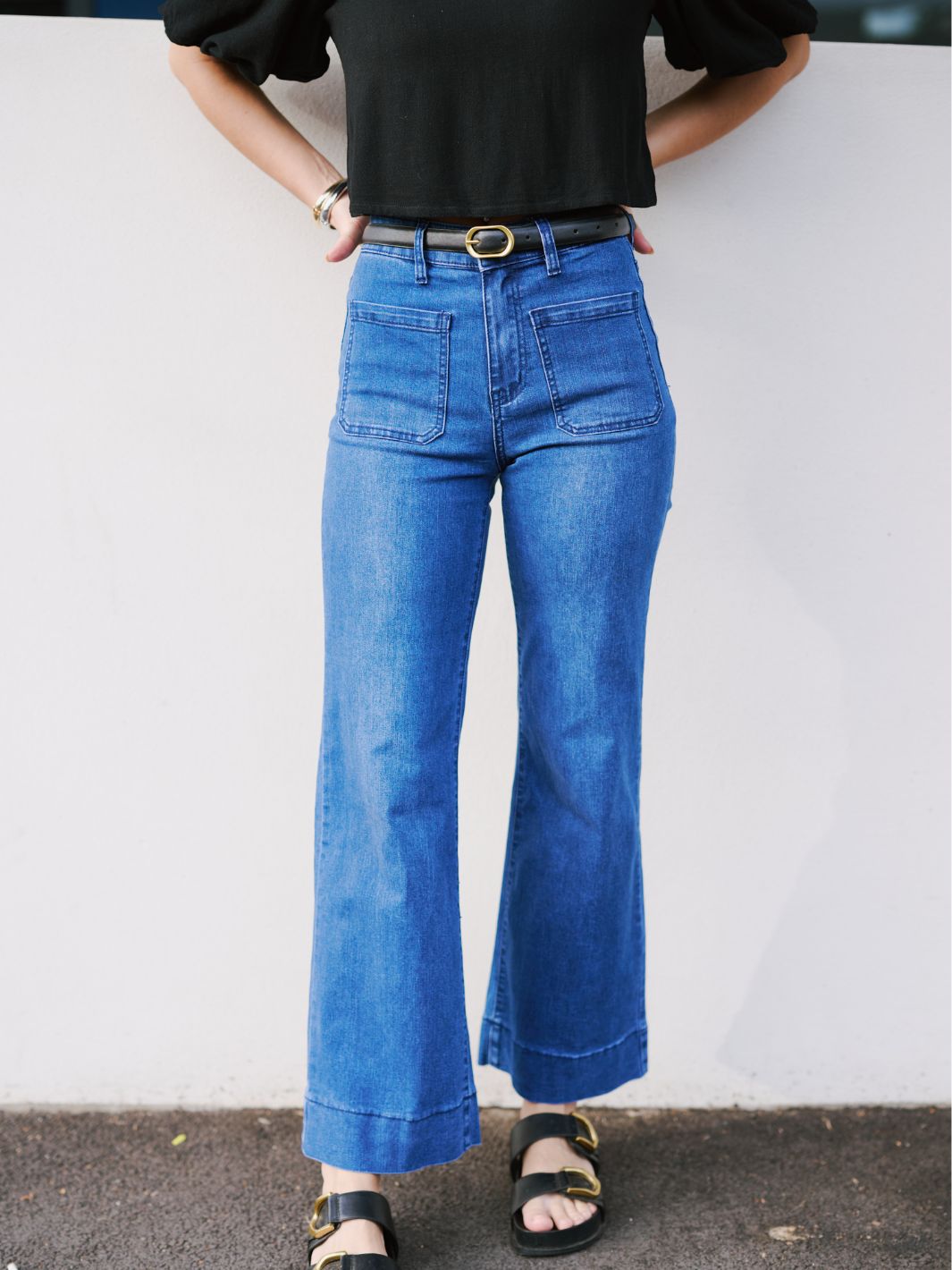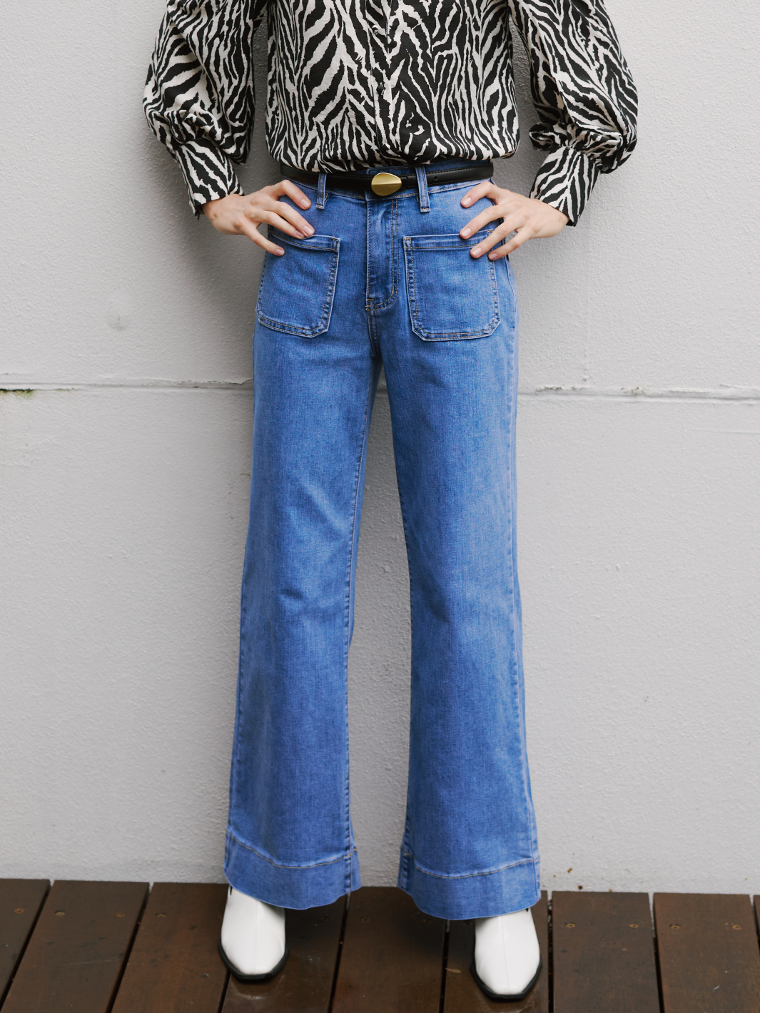 Introducing the WAYNE WIDE JEAN. Our flare cut and large cuff detail add a touch of retro to any outfit. With front patch pocket detailing, high waisted fit and stretch denim fabric, these jeans are both stylish and functional.